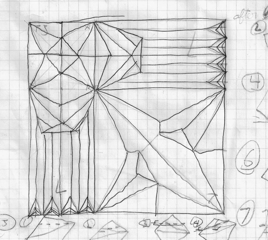 After getting about half way through Lang's Design Secrets book I wanted to design my first Origami. After about a month working on it, this is what I have so far (I had to use a scanner I have no camera)