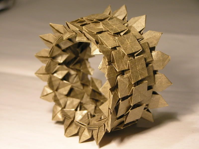 Make this tesselation on the rectangle and one end fold into another and make ring. Easy and impressive. But toilsome...